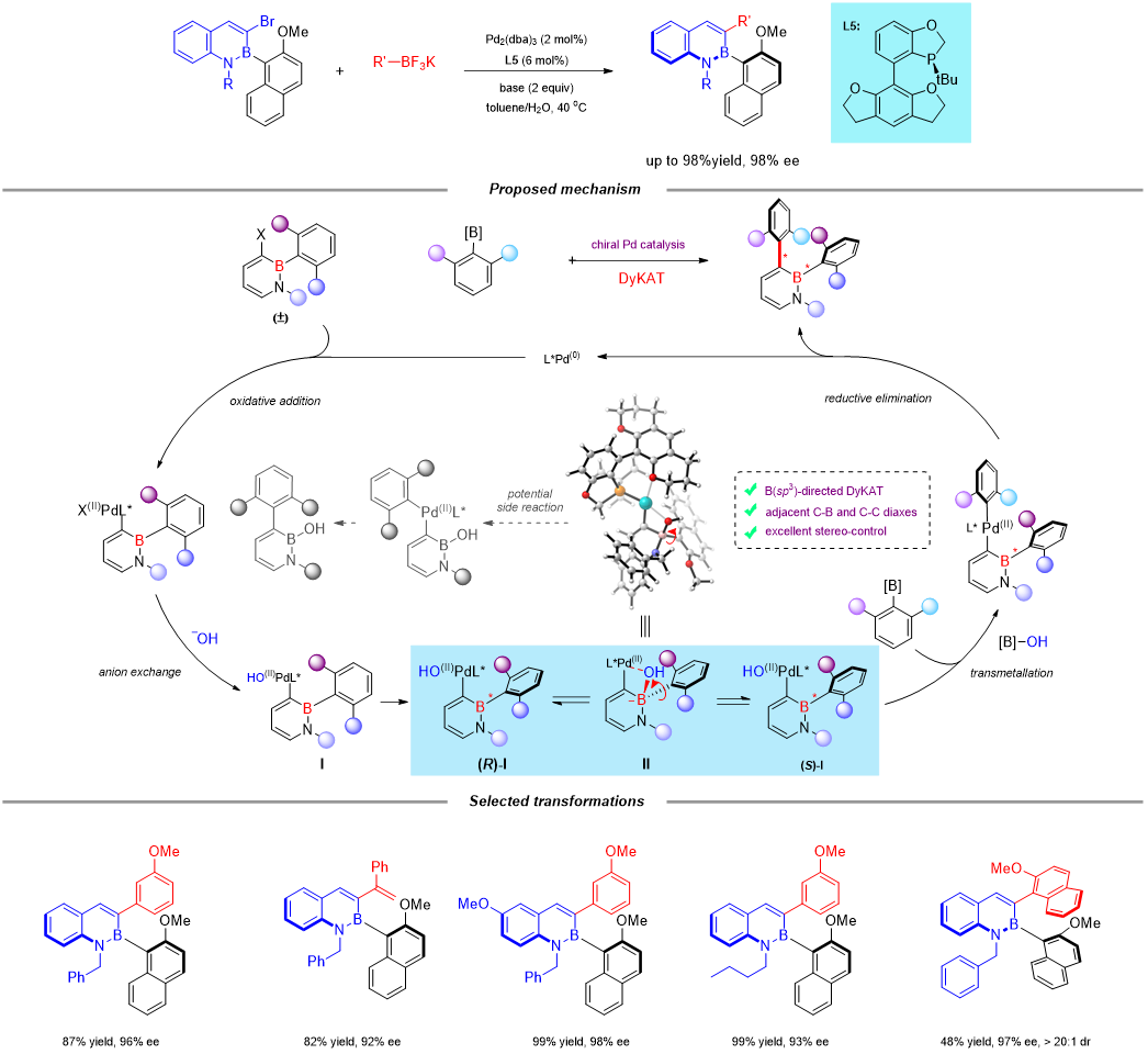 图一、四配位硼中间体介导的动态动力学不对称偶联反应构建C-B轴手性化合物