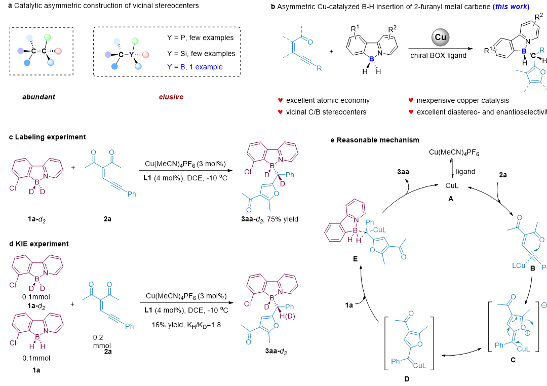 宋秋玲教授课题组不仅在C-B轴手性化合物的合成方面做出优秀工作,而且在手性四配位硼化合物的合成中也做出了重要工作,在2022年报道了一种铜催化的α-重氮苯乙酸酯的非映对和对映选择性不对称B-H键插入反应,首次同时构建了邻位碳-硼双立体中心化合物(Nat. Commun. 2022, 13, 2624)。邻位双立体中心的分子是天然产物和药物分子的普遍存在的结构单元,催化对映选择性构建邻位双立体中心化合物是有机合成领域中一个长期存在、非常具有挑战性的课题。与单碳中心分子相比,邻位碳-杂原子双立体中心进一步提高了分子的复杂性和多样性。烯炔酮化合物可以通过羰基对炔的亲核加成(5-endo-dig 环化)得到金属呋喃基卡宾,因此,烯炔酮化合物是合成各种取代的呋喃环骨架的有效前体,具有较好的化学选择性,高反应活性、官能团耐受性好、较好的原子经济性和反应条件温和等优点。在该工作中,作者利用烯炔酮作为呋喃卡宾前体和2-芳基吡啶-硼烷衍生物反应构建了邻位硼-碳双立体中心手性化合物(图四 b)。关键的卡宾中间体由烯炔酮化合物中的羰基对炔基部分的亲核加成原位生成。该反应以廉价的铜盐作为催化剂,起始材料易于获得,具有广泛的底物范围以及优异的对映选择性和非对映选择性,将对炔烃化学和羰基化学的发展具有重要的促进意义。同时通过细致的机理实验: 氘代标记实验 (图四 c), 动力学同位素效应 (KIE) 实验 (图四 d), 提出了一种合理的机制来解释这种插入反应 (图四 e)。该项成果发表在ACS Catalysis上。论文通讯作者为91快活林