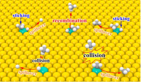 近三年来,林森课题组尝试从动态学的角度来理解催化现象,围绕多相催化中的物种溢流机理做了系统工作: JPCL, 2021, 12, 8423; JPCC, 2022, 126, 17093; JPCC, 2023, 127, 44, 21568; Angew. Chem. Int. Ed., 2023, e202312796; JACS Au, 2023, 3, 10, 2835; ACS Catal., 2024, 14, 2194;ChemPhysChem, 2024, e202400083。在此基础上,课题组近期基于DFT数据,通过机器学习加速的分子动力学模拟,研究了CH4气体环境条件下CH4解离的H和CH3物种在Rh/Cu(111)单原子合金表面溢流的机理。研究发现,随着表面温度升高H和CH3更倾向于重组成CH4分子并从表面脱附,仅靠升高表面温度来促进溢流的效果不佳。而CH4分子与吸附的H或CH3之间的频繁碰撞可以高效促进溢流。有趣的是,笨重的CH3比轻盈的H具有明显的溢流优势,因为多原子的CH3比H具有更大的碰撞截面,使其在碰撞中更容易获得足够的能量克服反应能垒而实现溢流。该工作继以往的H溢流研究,将单个原子的H推广到多原子基团的CH3,为研究关键物种的溢流效应提供了更加广袤的探索空间。