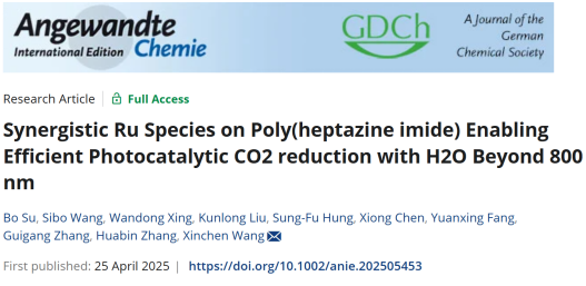 “Synergistic Ru Species on Poly(heptazine imide) Enabling Efficient Photocatalytic CO2 Reduction with H2O Beyond 800 nm”, Bo Su, Sibo Wang*, Wandong Xing, Kunlong Liu, Sung-Fu Hung, Xiong Chen, Yuanxing Fang, Guigang Zhang, Huabin Zhang, Xinchen Wang*, Angew. Chem. Int. Ed. 2025, e202505453. DOI:10.1002/anie.202505453