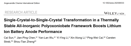 论文信息:“Single-Crystal-to-Single-Crystal Transformation in a ThermallyStable All-Inorganic Polyoxoniobate Framework Boosts LithiumIon Battery Anode Performance”,Cai Sun, Jian-Ping Chen, Yan-Lan Wu, Yi-Ying Li, Xin-Xiong Li, Ping-Wei Cai, Carsten Streb, Shou-Tian Zheng , Angew. Chem. Int. Ed. 2025, e202506533.