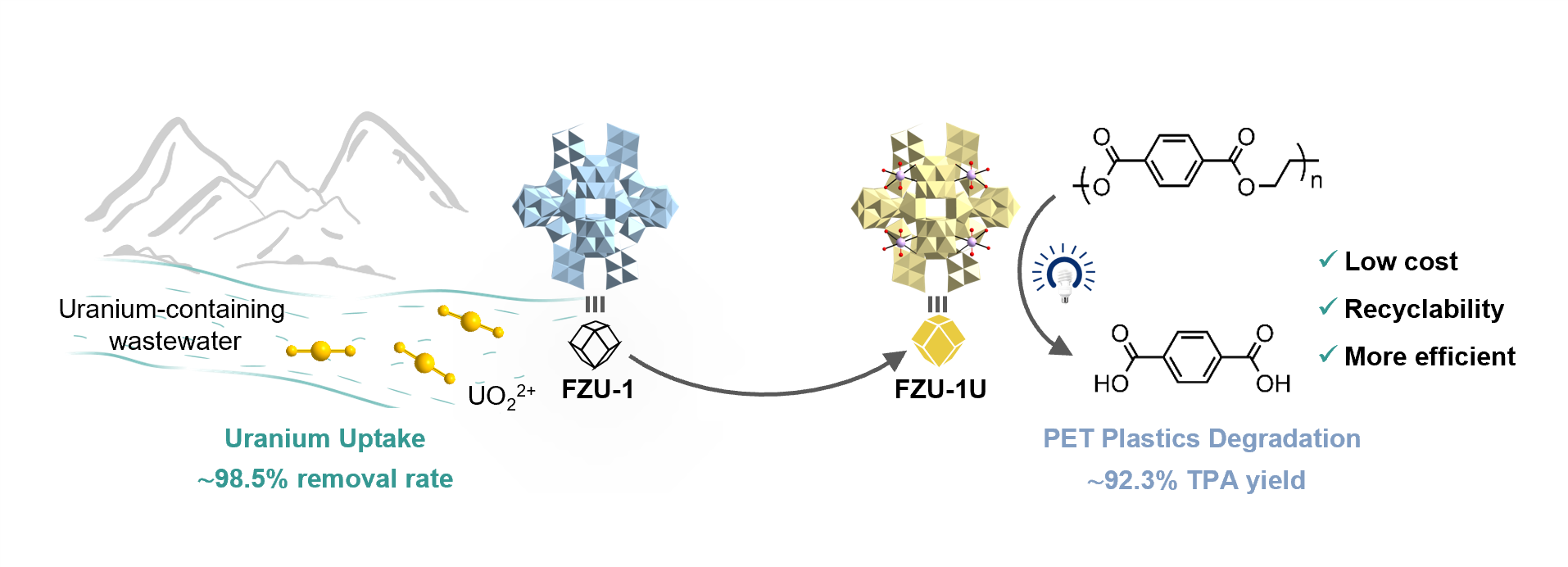 一方面,聚对苯二甲酸乙二醇酯(PET)塑料的高稳定性,使其回收与降解长期面临能耗高、成本大、二次污染等瓶颈。另一方面,铀矿开采和提炼过程中产生的含铀废水,因其毒性与复杂性,对环境构成严重威胁。团队提出了一种“一石二鸟”的新策略:利用全无机多铌酸盐框架(PONb, FZU-1)高效捕获废水中痕量铀酰离子,并通过吸附铀酰后的FZU-1U作为光催化剂,实现了铀资源回收与PET塑料光催化降解的耦合。