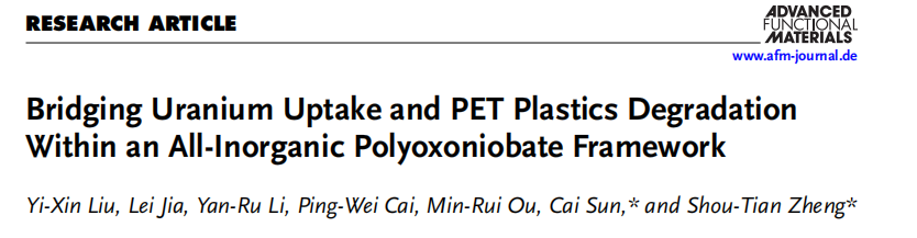 论文信息: Bridging Uranium Uptake and PET Plastics Degradation Within an All-Inorganic Polyoxoniobate Framework. Adv. Funct. Mater. 2025, e16939. DOI: 10.1002/adfm.202516939.