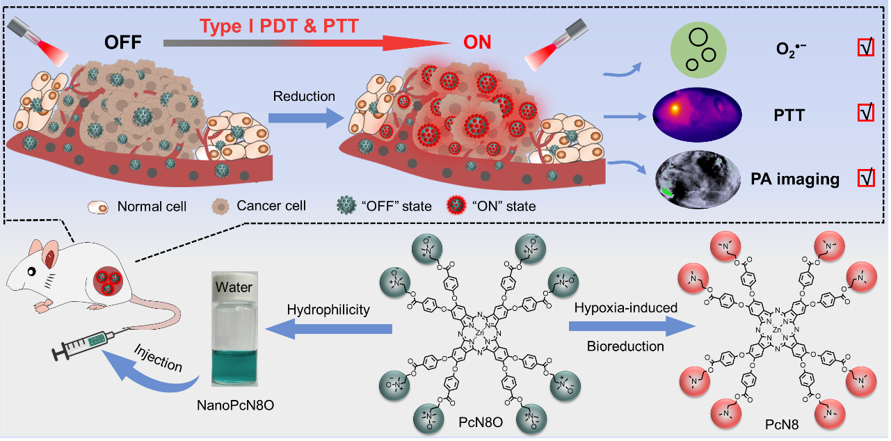 针对这些问题,李兴淑教授团队开发了一种八取代酞菁锌(II)衍生物(PcN8O,图1),该衍生物具有八个N-氧化物基团。PcN8O表现出优异的亲水性,其固体粉末可以直接分散于水中,无需添加任何有机溶剂,可自发形成均匀稳定的纳米分散体系(NanoPcN8O),纳米分散体系的酞菁分子浓度可高达29 mg/mL。而且,NanoPcN8O可以在缺氧条件下发生生物还原生成富含叔胺基团的产物NanoPcN8,开启I型光动力学反应(生成O2·-)并同步激活光热效应产热。凭借这些特性,NanoPcN8O展现出克服肿瘤缺氧的潜力。在缺氧环境下,NanoPcN8O对4T1细胞具有明显的光细胞毒性,半数最大抑制浓度(IC50)为0.14 ± 0.01 μM,比商用PS亚甲基蓝低了86倍。此外,NanoPcN8O还具有优异的肿瘤光声(PA)成像功能。当NanoPcN8O用于临床前模型的肿瘤光疗时,通过I型PDT和光热疗法(PTT)的联合作用实现了显著的实体瘤抑制。值得关注的是,NanoPcN8O即使在光照射下也不会引发传统“Always ON”型PS常见的光毒性皮肤副作用。因此,这项研究为缺氧性肿瘤的诊断和安全治疗提供新的视角。