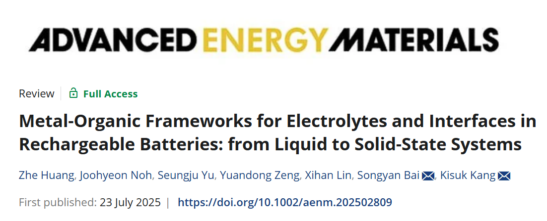 论文信息:Z. Huang, J. Noh, S. Yu, Y. Zeng, X. Lin, S. Bai, K. Kang, Metal-Organic Frameworks for Electrolytes and Interfaces in Rechargeable Batteries: from Liquid to Solid-State Systems. Advanced Energy Materials. 2025, //doi.org/10.1002/aenm.202502809