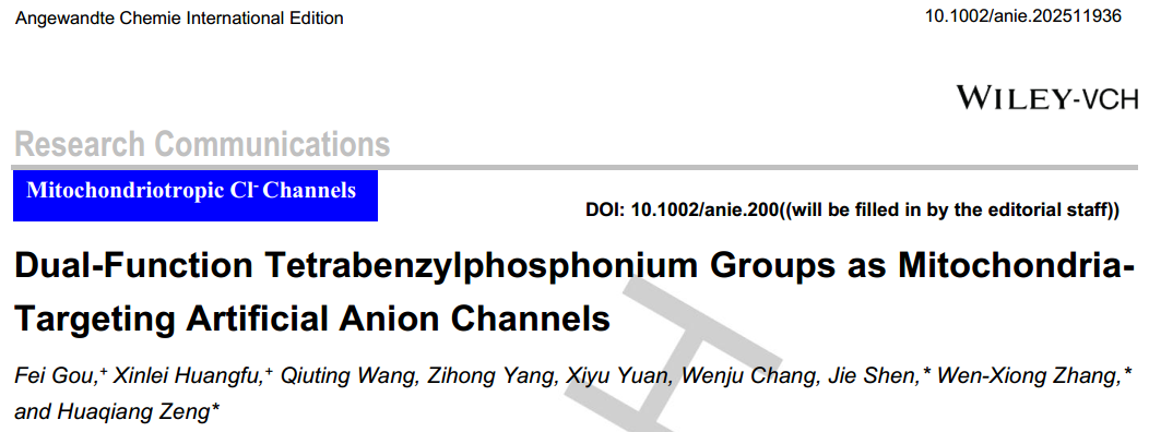 论文信息: F. Gou, X. L. Huangfu, Q.T. Wang, Z. H. Yang, X. Y. Yuan, W. J. Chang, J. Shen*, W-X. Zhang*, and H. Q. Zeng*. Dual-Function Tetrabenzylphosphonium Groups as Mitochondria-Targeting Artificial Anion Channels. Angew. Chem. Int. Ed. 2025, e202511936. //doi.org/10.1002/anie.202511936