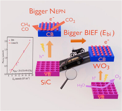 沈锦妮副教授和张子重教授课题组在前期碳化硅基异质结的研究基础上(J. Am. Chem. Soc. 2018, 140, 14595.,Nat. Commun. 2020, 11, 3043.,J. Colloid Interface Sci. 2022, 622, 31.,Chin. J. Catal. 2023, 50, 239.,Inorg. Chem. 2024, 63, 14591.),分别通过水热水解和磁控溅射方法制备了粉末和单晶碳化硅/三氧化钨(SiC@WO3)异质结光催化剂。随后,他们概述了半导体物理学中关于大块半导体异质结内建电场强度或内建电势的定义、理论计算和测定原理,建立了测定粉末异质结样品的内建电势(Vbi)和单晶异质结样品的内建电场(Ebi)的方法;测定了两个样品对于CO2与H2O反应的光催化活性和产物分布,引入有效光电子利用总数(NEPN)表示光催化活性;对Vbi或Ebi与NEPN进行定量关联分析,获得原创性发现。