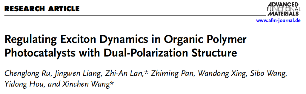 论文信息:Chenglong Ru, Jingwen Liang, Zhi-An Lan,* Zhiming Pan, Wandong Xing, Sibo Wang, Yidong Hou, and Xinchen Wang*. Regulating Exciton Dynamics in Organic Polymer Photocatalysts with Dual‐Polarization Structure. Adv. Funct. Mater. 2025, e21894. DOI: 10.1002/adfm.202521894