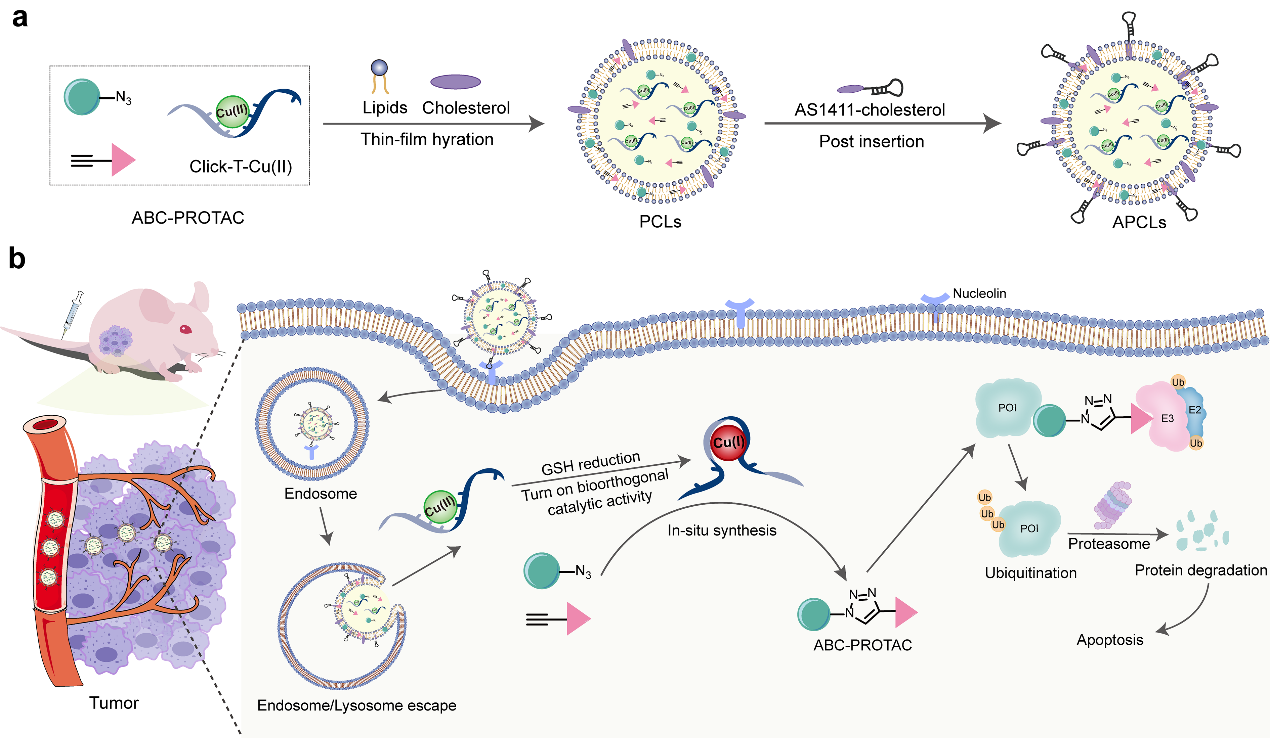 本研究构建了一种病理微环境激活的通用型生物正交催化平台,用于在肿瘤内原位生成PROTAC。该策略将两个小分子前体与谷胱甘肽(GSH)响应的Click-T-Cu(II)预催化剂共同封装于靶向脂质体中,使其在肿瘤区域富集,并被癌细胞中高浓度GSH激活,进而通过点击化学反应生成活性PROTAC分子。该平台在体外和体内均能有效降解致癌蛋白,展现出强效的抗肿瘤效果,并具备良好的生物相容性与靶细胞选择性。通过便捷替换靶向“弹头”,该平台可降解多种疾病相关蛋白(如Brd4、PARP1、NF-κB等),显示出广泛的适用性。ABC-PROTAC平台不仅克服了传统PROTAC技术生物利用度低和脱靶毒性强的问题,其模块化设计也为拓展至其他靶向降解策略提供了通用方案,为发展精准蛋白质降解疗法开辟了新途径。