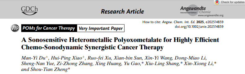 论文信息:Man-Yi Du†, Hui-Ping Xiao†, Ruo-Fei Xu, Xian-Bin Sun, Xin-Yi Wang, Dong-Miao Li, Sheng-Nan Yue, Zi-Zhong Zhang, Xing Huang, Yu Gao*, Xiu-Ling Shang*, Xin-Xiong Li*, Shou-Tian Zheng*. A Sonosensitive Heterometallic Polyoxometalate for Highly Efficient Chemo-Sonodynamic Synergistic Cancer Therapy. Angew. Chem. Int. Ed. 2025, e202514859. DOI: 10.1002/anie.202514859