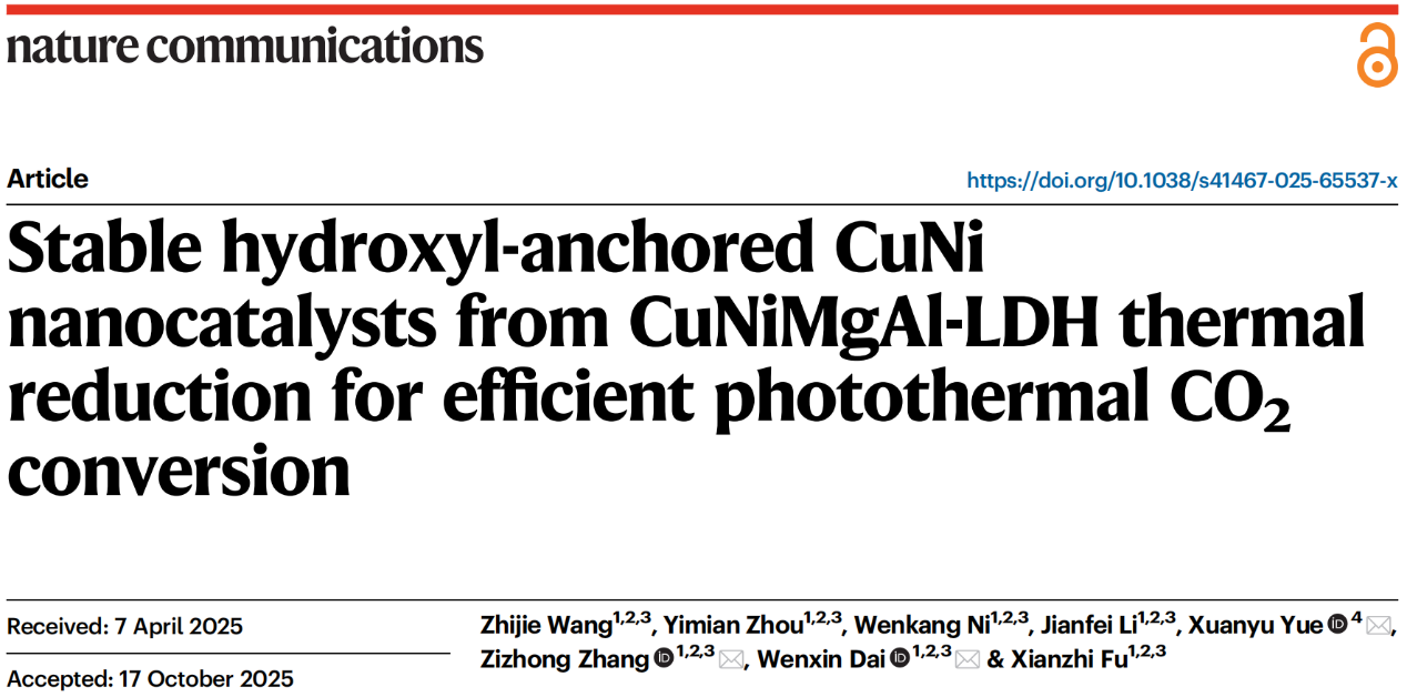 Wang, Z., Zhou, Y., Ni, W. et al. Stable hydroxyl-anchored CuNi nanocatalysts from CuNiMgAl-LDH thermal reduction for efficient photothermal CO2 conversion. Nat. Commun. 16, 10497 (2025). DOI: //doi.org/10.1038/s41467-025-65537-x