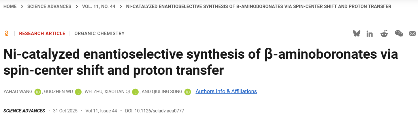 宋秋玲教授课题组在国际权威期刊Science Advances上发表题为“Ni-catalyzed enantioselective synthesis of β-aminoboronates via spin-center shift and proton transfer”的研究成果。该研究发展了一种镍催化的还原偶联策略,实现β-胺基硼酸酯的对映选择性合成。