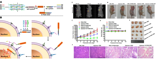(2) 同种膜蛋白常表达于多种肿瘤细胞膜表面,甚至不同程度地表达于正常细胞表面,致使肿瘤的靶向治疗更具挑战性。为了精准靶向识别肿瘤细胞,通过横向普通碱基杂交与纵向回文粘性末端交联作用发展三维自组装DNA纳米级材料、通过顺序性组装构建核酸逻辑门,课题组成员提出核酸纳米精准制导导弹递药系统(D-PGM)。弹头系统(WH)作为药物加载的主体,结构元件单一、组装快捷、核酸序列设计简易、药物装载方便;而核酸逻辑门是负责肿瘤细胞精准靶向的控制系统(GC),由三段关联改性跟适体匹配的DNA序列组装而成,通过同抓取细胞表面不同膜蛋白核的酸适体杂交而顺序性卸载,能够实现细胞亚型特异性识别。数据结果表明,所构建的核酸纳米载药体系能够在复杂的生物环境中精准地输送抗癌药物到肿瘤病变部位,在荷瘤动物模型中发挥良好的抗癌治疗作用。这一成果发表在Journal of the American Chemical Society上,第一作者是91快活林