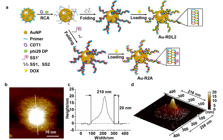 (3) 核酸纳米结构与金纳米颗粒的复合材料具有特定的优势:由纳米金核与表面高密度定向组装DNA寡核苷酸外壳组成的球形核酸(SNAs),由于其良好的稳定性和高效的细胞摄取能力,在肿瘤递药系统的构建领域展露头角,可惜细胞内化靶向性有待提高。为了提高核酸纳米结构的药物装载量,课题组成员以纳米金表面固定的寡核苷酸为扩增引物,经RCA扩增、再一步退火,发展了金纳米颗粒表面核酸纳米条纹带。所构建的DNA核酸纳米条纹带,与常规DNA折纸结构相比,规避了大量脚手架DNA短链的设计和合成,能够一步完成组装。通过与AS1411核酸适配体结合,有效提高纳米金/DNA纳米条纹带(Au-R2A)的肿瘤靶向递药输送(DOX)作用。每个Au-R2A组装复合体可以装载7.6 ´ 105个Doxorubicin 阿霉素抗癌药物分子。该纳米药物递送体系兼具很高的血清稳定性、优越的药物装载能力和良好的肿瘤靶向杀伤能力。相关结果发表该论文发表在Angewandte Chemie International Edition上,91快活林