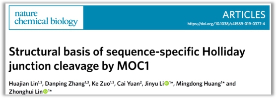 林忠辉研究员研究团队在DNA损伤修复分子机制的研究上取得重要进展,论文以“Structural Basis of Sequence-specific Holliday Junction Cleavage by MOC1”为题发表在《Nature Chemical Biology》杂志上。