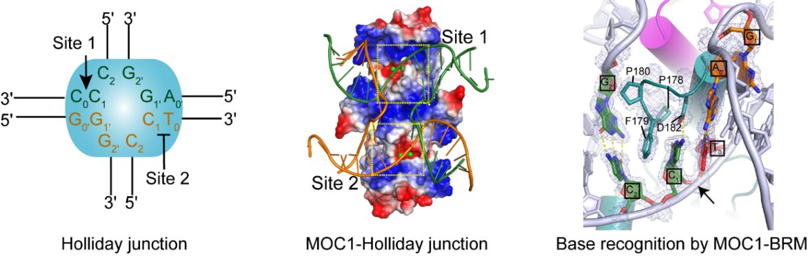 Holliday junction(HJ)是英国分子生物学家Robin Holliday于1964年首次发现,是在DNA同源重组损伤修复过程中形成的一种十字叉状的DNA连接体,在噬菌体、细菌、真菌、植物乃至动物细胞中均存在。在DNA损伤修复完成后,HJ必须在HJ解离酶的作用下解离,从而促使两条同源DNA双链分开重新成为线性DNA1。MOC1(monokaryotic chloroplast 1)是一个叶绿体特异的HJ解离酶2。