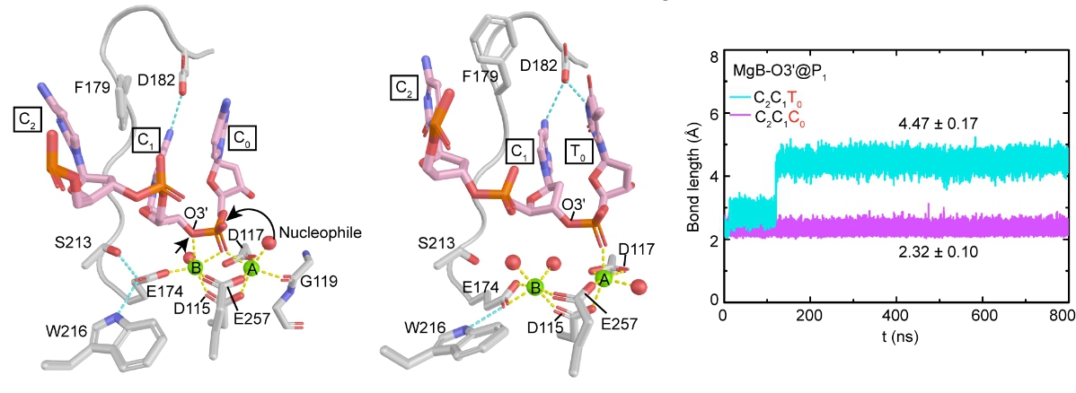 图2.分子动力学模拟揭示DNA底物序列不同引起金属离子配位的变化