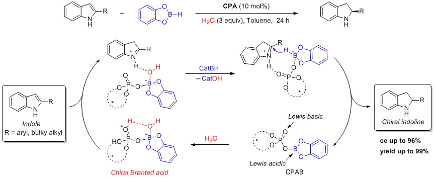在不对称化学领域,手性Brønsted酸由于其高反应活性和选择性,成为了化学家们强有力的帮手。尽管手性Brønsted酸的研究已经取得了巨大的进步,仍然非常需要开发新型的手性Brønsted酸。水是非常弱的Brønsted酸,但当水与Lewis酸硼络合将会转化成强Brønsted酸,并伴随着与众不同的反应活性。