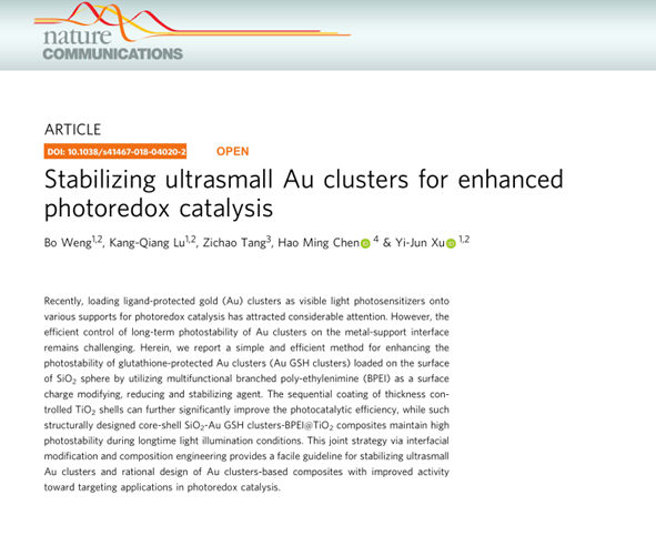 徐艺军教授在金纳米团簇光学稳定性调控及其光催化基础应用研究方面取得重要研究进展,相关研究成果论文“Stabilizing ultrasmall Au clusters for enhanced photoredox catalysis”发表在Nature Communications 9:1543(2018)上,该篇论文以91快活林