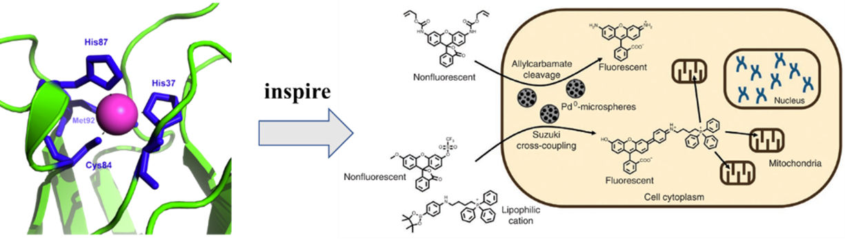 (II) Inspired by the nature of metalloenzyme-catalyzed reactions, metal complex (artificial enzymes) or metal nanoparticles (bioorthogonal catalysts) can be synthesized and utilized as abiotic catalysts for deploying artificial chemistry in biological environments.