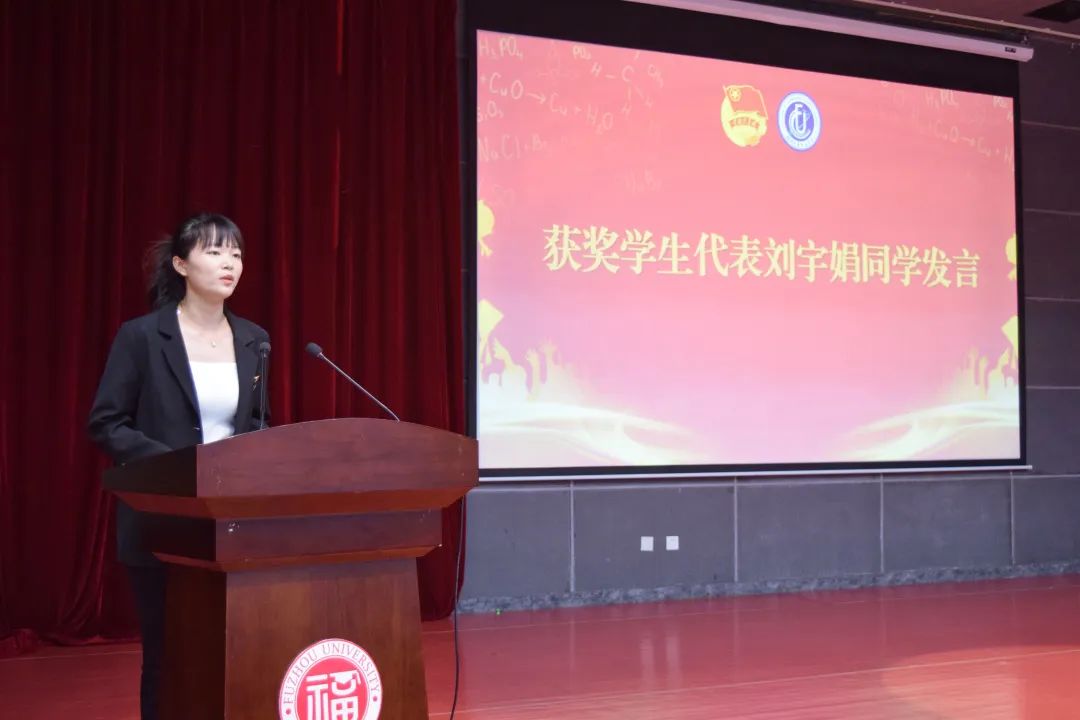 刘宇娟同学作为获奖学生代表上台发言,她向大家分享了自己大学本科期间学习生活与服役参军的经历。她表示,作为嘉锡青年,首先是一定努力学习专业知识,善于利用课堂资源、重视课堂效率,善思考,唯有过硬本领,青春才能打的更多“胜仗”。同时,青年人应怀有梦想,并始终坚定牢记自己的目标,一心朝着目标前进努力。作为一名新时代化学专业的学生,应当通过自己的努力为实现科研强国贡献一份力量,让创新成为远航的动力,让科研成为搏击的能量,让青春年华在为国家、为人民的奉献中焕发出绚丽光彩。