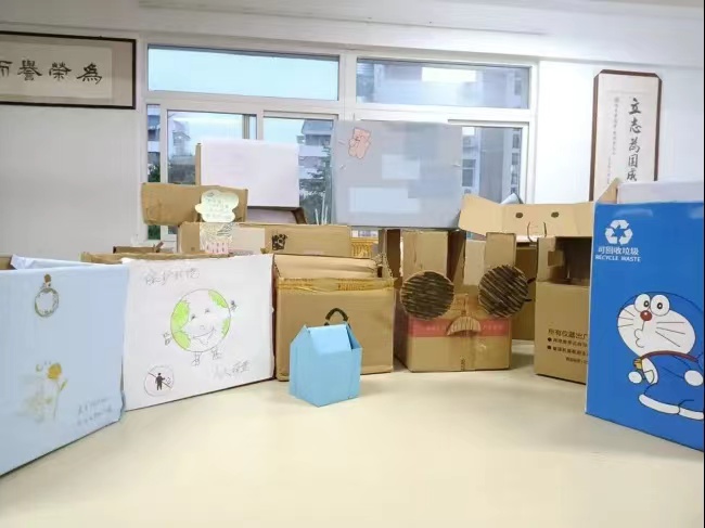 “为响应国家绿色新发展理念,通过利用废弃纸盒,打造出富有趣味性的DIY垃圾箱,让生活中不起眼的废弃纸箱被二次利用,焕发新的生机。”