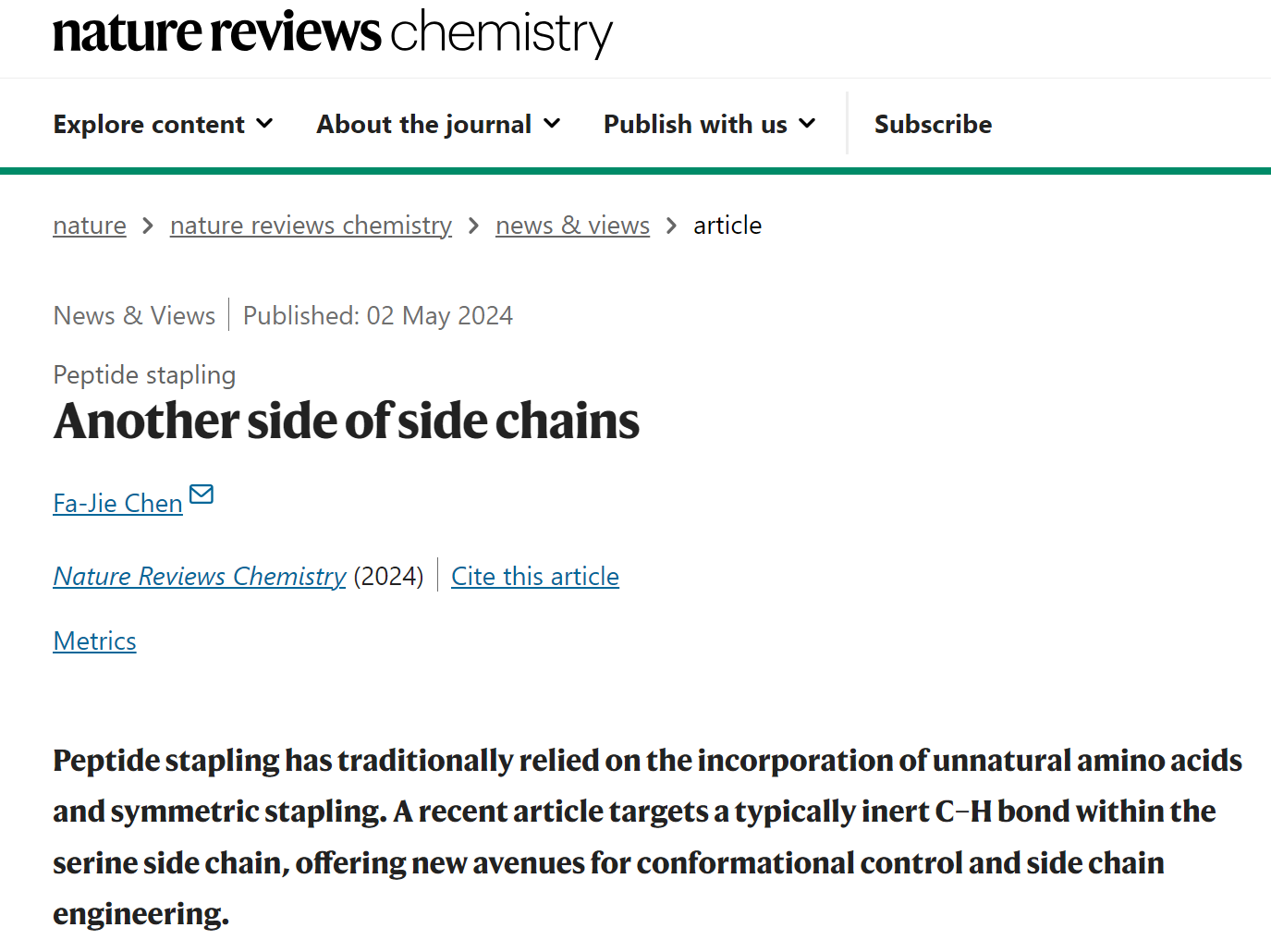 陈发杰副教授应邀在国际顶尖学术期刊 《Nature Reviews Chemistry》(Q1,影响因子36)发表题为“Another side of side chains”的新闻与观点(“News & Views”)论文,对兰州大学许兆青课题组在天然多肽非对称装订领域的最新突破性进展进行了评述和展望。陈发杰副教授是91快活林