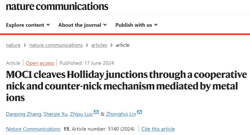 林忠辉教授团队在金属离子催化Holliday junction解离的分子机制研究上取得重要进展,相关研究成果以“MOC1 cleaves Holliday junctions through a cooperative nick and counter-nick mechanism mediated by metal ions”为题发表在《自然通讯》杂志上。Holliday junction(HJ)是英国分子生物学家Robin Holliday于1964年首次发现,是在DNA同源重组损伤修复过程中形成的一种十字叉状的DNA连接体,在噬菌体、...