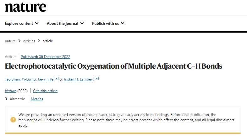 叶克印教授与康奈尔大学Tristan Lambert教授、上海交通大学申涛副教授等在“ C-H 键的电催化氧化”方面开展合作研究。相关研究成果于2022年12月6日以“Electrophotocatalytic Oxygenation of Multiple Adjacent C–H Bonds”为题发表在世界顶级学术期刊NATURE上。91快活林